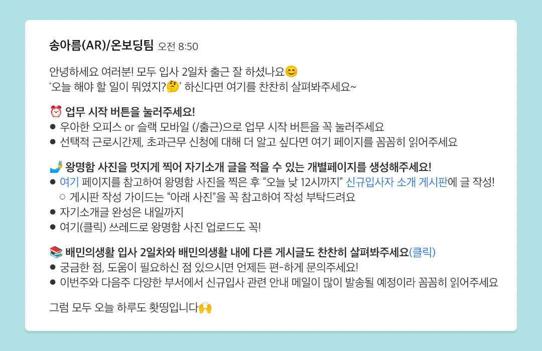 난 온보딩팀 손바닥 위에 있었나 보다. 아직 텅 비어있던 공간에 온보딩팀으로부터 메시지 하나가 도착했다. 그 마음 다 안단 듯, 오늘 해야 할 일들을 차근히 짚어주던 온보딩팀의 메시지.