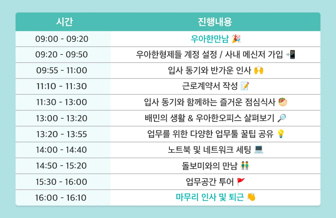 이 시간에는 근무제도와 업무공간 등 입사 후 생활과 관련된 부분들은 물론이고 궁금했던 복지제도에 대해서도 살펴볼 수 있었다. 단순히 정보들의 나열이 아니라, 입사 후 어떤 시기에 무엇을 해야 할지 정리된 부분이 참 좋았다. 2일 차에는 인사 정보를 기입해야 한다던가, 3일 차에는 법인카드를 신청하라는 등의 안내였는데, 방법이 상세하게 함께 기재되어 있어서, 하나하나 따라 하면 놓치는 부분 없이 우아한형제들에서의 생활을 잘 시작할 수 있을 것 같다.