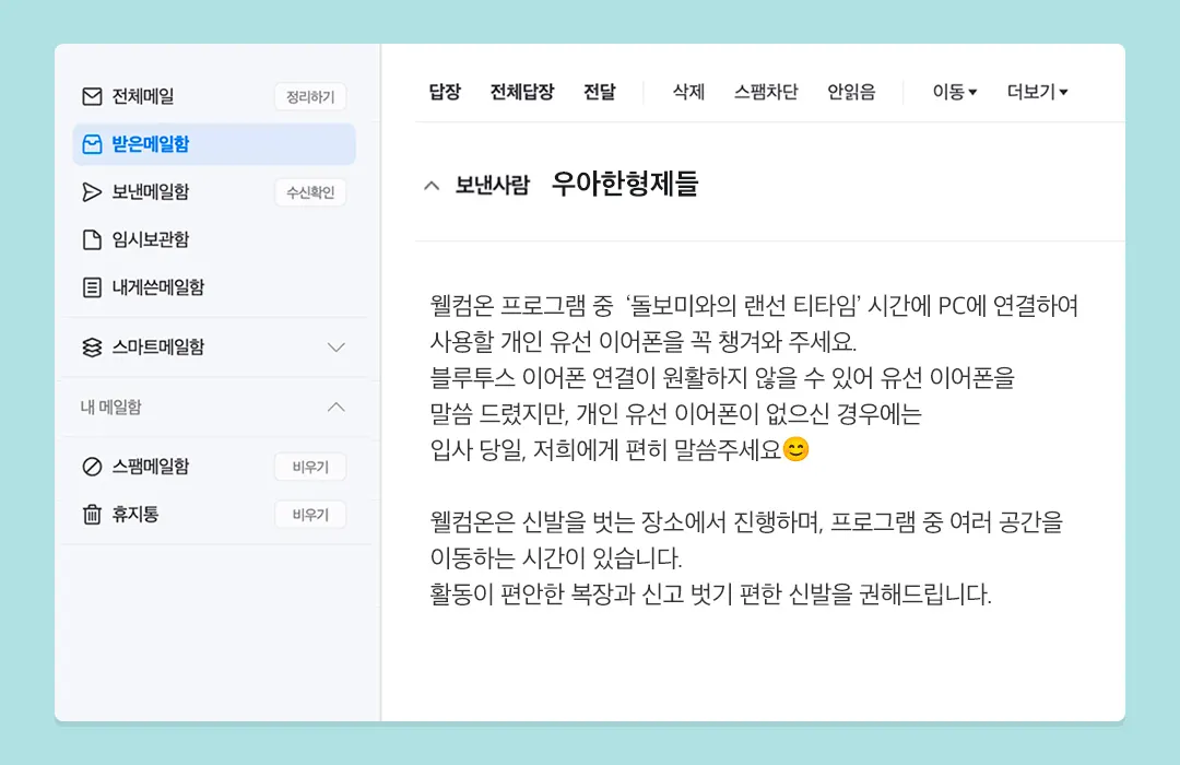 필요했던 정보들을 쏙쏙 전해주던 문자를 닫고 얼른 메일함을 열었다. 문자로 이야기해준 것처럼 메일함에는 더 자세한 내용이 담긴 입사 가이드가 도착해 있었다. 입사 가이드에는 입사 당일 준비물부터 찾아오는 길(심지어 사진첨부!), 당일 진행되는 프로그램, 사원증 촬영 안내까지 알차게 실려있었다.