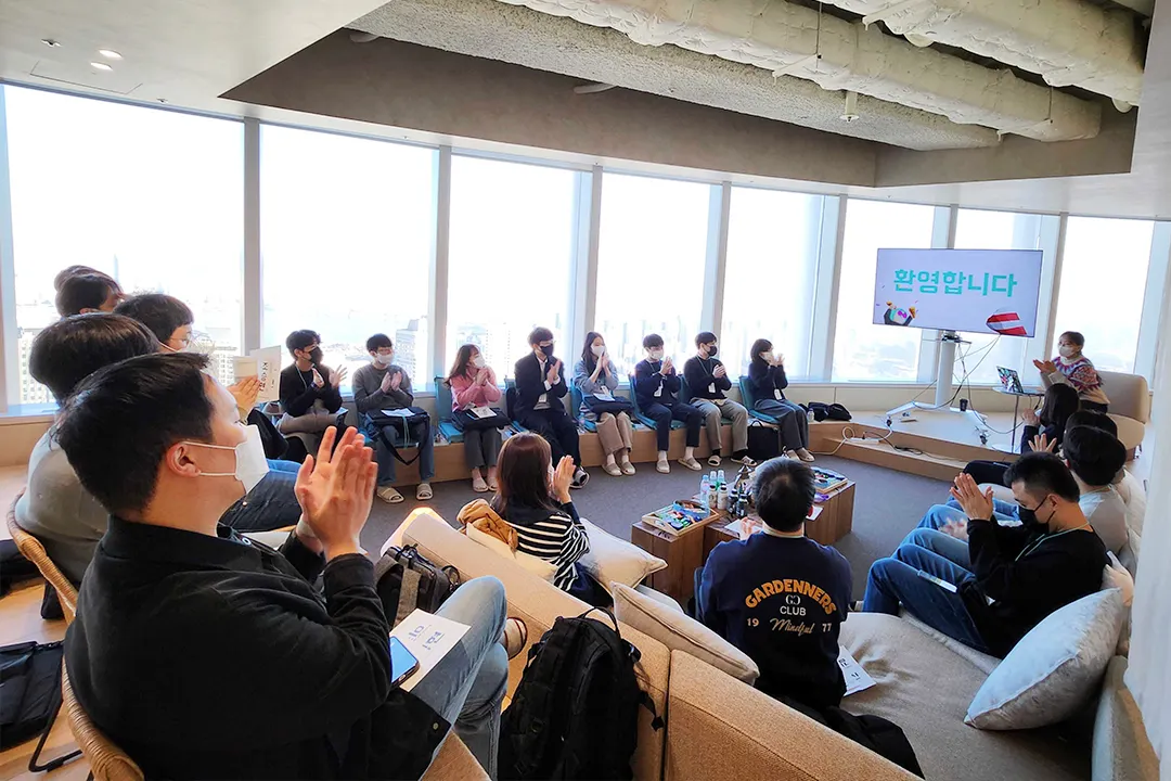 아름 님을 따라 도착한 곳은 롯데타워 38층에 위치한 “청평 같은 방”이었다. 문이 열리자 신나는 음악과 그보다 들뜬 음성으로 맞이해 주시는 온보딩팀 팀원분들이 보였다.